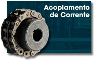 Os acoplamentos de corrente consistem em dois cubos engrenados radialmente que são engatados por uma corrente dupla de rolos. São usados em aplicações onde a velocidade é entre baixa e moderada, e torque alto.